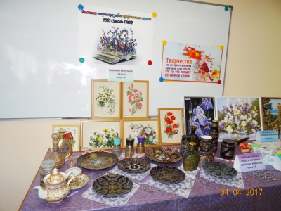 Татьяна Крель (главный специалист по учебно-методической работе ППО) представила точечную роспись по стеклу и керамике в восточном стиле: с мексиканской росписью - настенные тарелки и кружки, с турецкой - сахарницы, графины, вазы и кувшины. Татьяна Вихляева (юрисконсульт профкома) продемонстрировала мастерство росписи по номерам – первый раз в жизни нарисовала 2 пейзажа акриловыми красками.