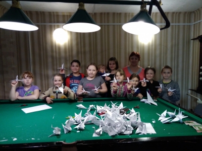 С детьми работали специалист первички А. Дорохина и заведующая клубом Н. Кокошникова. Сначала было нелегко. Взрослые терпеливо помогали детям в сложных моментах. И вот первый красивый журавлик получился. Затем работа пошла веселее.