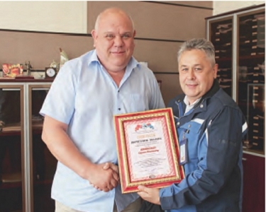Награду союза «Белгородское областное объединение организаций профсоюзов» Сергею Шишковцу вручил председатель ППО ОАО «Оскольский электрометаллургический комбинат» Александр Лихушин.