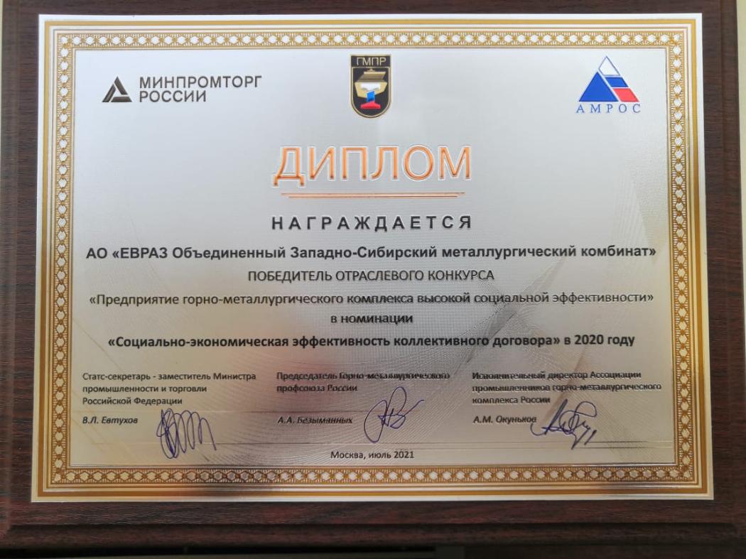 ЕВРАЗ ЗСМК стал победителем XVIII отраслевого конкурса «Предприятие горно-металлургического комплекса высокой социальной эффективности» в номинации «Социально-экономическая эффективность коллективного договора» в 2020 году.