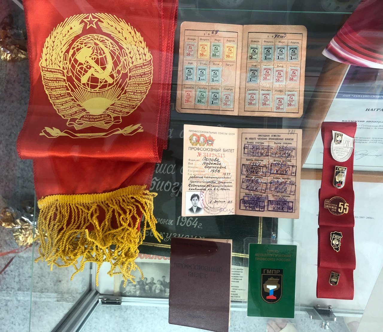 Профсоюзный билет конца 60-х годов, диплом ударника труда, архивные коллективные договоры и номер профсоюзной газеты…